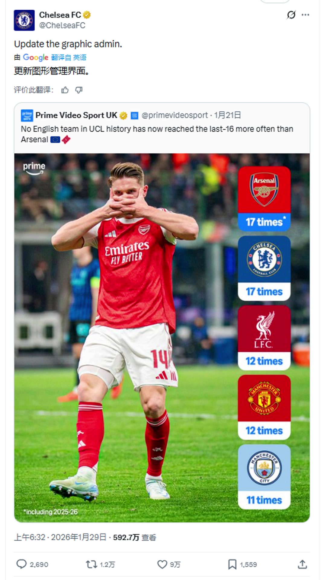 在欧冠史上,没有哪支英格兰球队比阿森纳更频繁晋级16强!切尔西官方:请更